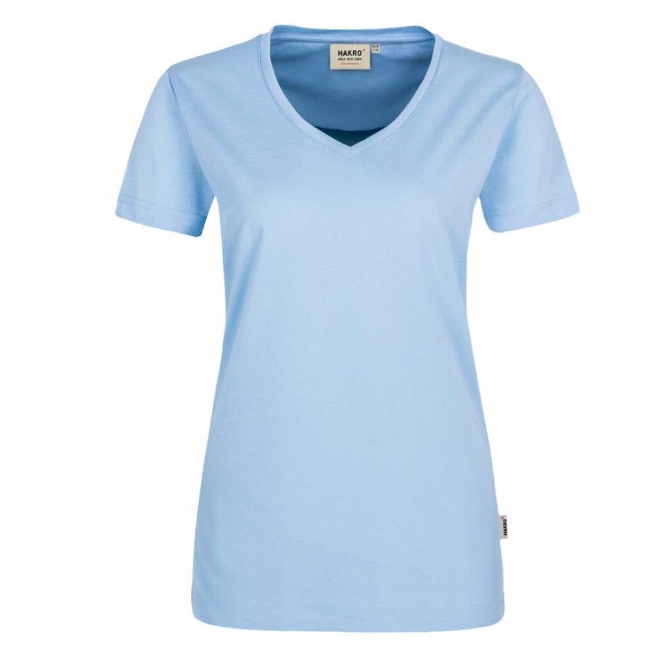 Besonders strapazierfähiges T-Shirt für Damen, mit femininem V-Ausschnitt, geripptem Halsbündchen und Nackenband. Leasingkoller zur einfachen Kennzeichnung in der gewerblichen Wäscherei und Aufhängebänder im Saum. Hergestellt aus weichem, besonders pflegeleichtem und funktionellem, mittelschweren Single-Jersey aus dem HAKRO Performance-Materialmix Mikralinar®. Gewebtes HAKRO Necklabel aus hochwertigem Kettsatin mit weichen, ultraschallgeschnittenen Bandkanten für höchsten Tragekomfort und gewebtes HAKRO Flaglabel an der linken Seitennaht.