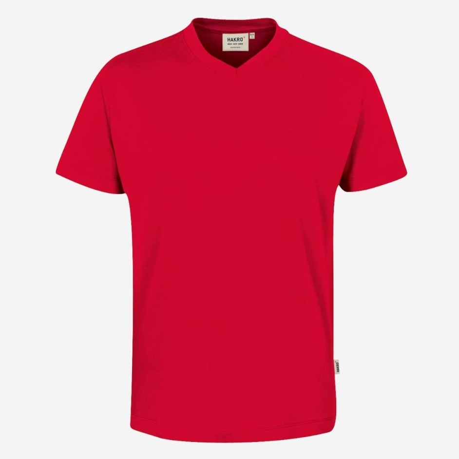 Klassisches T-Shirt mit V-Ausschnitt, LYCRA®-verstärktem Halsbündchen und Nackenband. Hergestellt aus feinem, mittelschwerem Single-Jersey aus langstapeliger, gekämmter und ringgesponnener Baumwolle. Gewebtes HAKRO Necklabel aus hochwertigem Kettsatin mit weichen, ultraschallgeschnittenen Bandkanten für höchsten Tragekomfort und gewebtes HAKRO Flaglabel an der linken Seitennaht.